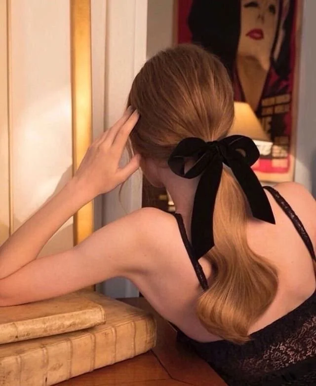 The onset of bitterly cold weather brings about a nesting feeling, one that keeps your tush at home to play dress up and get experimental with hearty recipes whenever possible. Currently, my latest obsession has been with velvet bows worn in the hair. It has a precociously seductive air to it, especially as I had recently witnessed a mother and her daughters sporting matching styles at the Nutcracker Ballet at The Kennedy Center. Much to my chagrin, black velvet against black hair doesn’t have the same effect, but plush options like an ivory satin or tulle has a similar effect. My best suggestion to get the look is to buy a thick velvet ribbon off of amazon. 2-3” should be wide enough depending on your hair type!