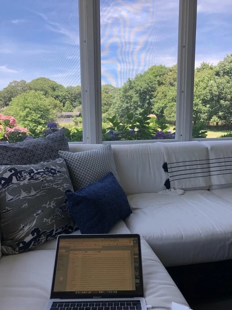 Most days, I work on our screened porch that faces the pond, which not only protects me from the sun but still allows the cooling Hamptons ocean breeze to come through and provides relief from the summer heat. It is my favorite enclave, and in the winter we turn on the radiant floor heat and replace the screens with insulated glass panels; perfect for our annual Christmas Eve dinner party where we set a long table the length of the porch, which is sadly not likely to happen this year due to COVID-19.